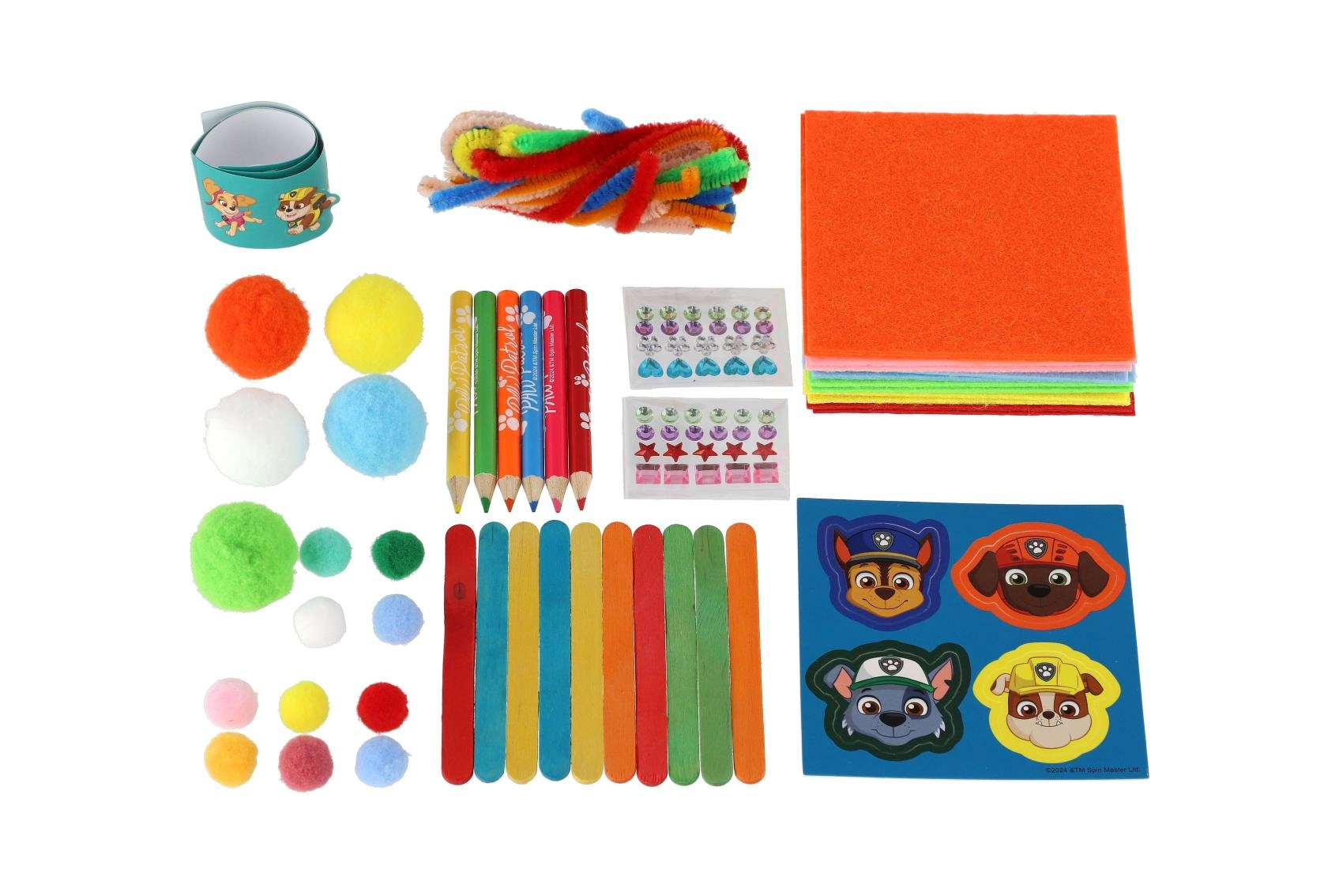 - Bogate wyposażenie – pompony, puszyste druciki, kształty z pianki, patyczki, kredki oraz naklejki PSI PATROL.