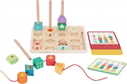 Zawiera kilka rodzajów kart, które zapewniają różnorodność zabawy – dzieci mogą nakładać kształty według własnej fantazji lub zgodnie z gotowymi obrazkami na kartach. Jeśli karta nie odpowiada, zawsze można wymienić ją na inną!