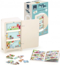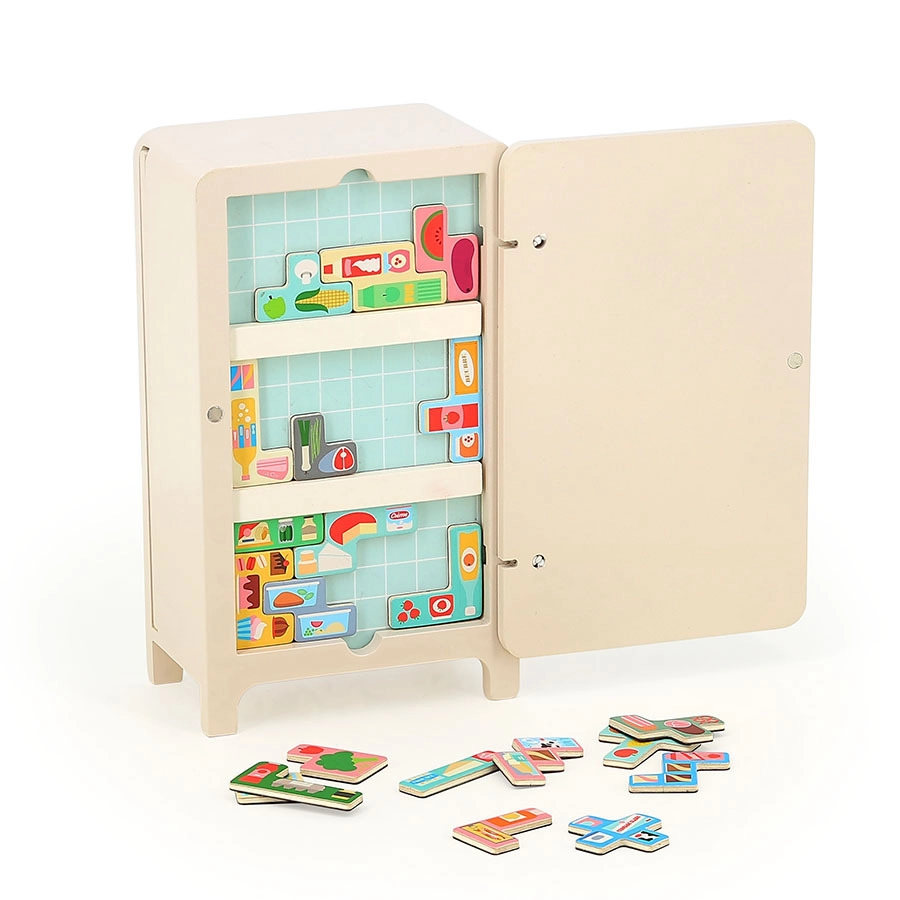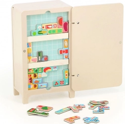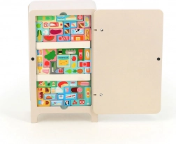 Gra z projektem Ingeli P. Arrhenius zawiera drewnianą lodówkę, dwie magnetyczne półki i 21 magnetów przedstawiających produkty spożywcze. Dzieci mogą tworzyć własne ułożenie w lodówce, co wspiera ich kreatywność i umiejętność rozwiązywania problemów. Dołączona broszura z instrukcjami oferuje 7 różnych rozwiązań.