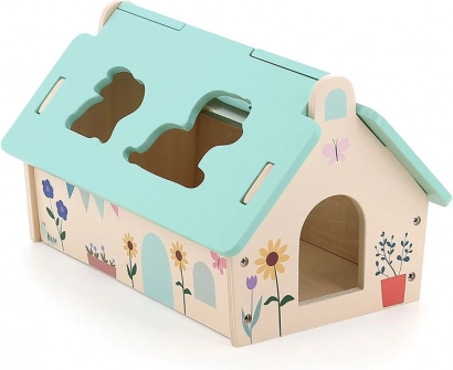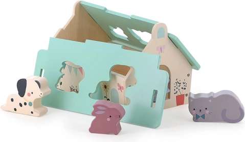 Ten pięknie wykonany drewniany domek w delikatnych kolorach został zaprojektowany przez Sarah Betz i posiada zdejmowany dach z wyciętymi otworami do wkładania zwierzątek. To wczesnorozwojowa zabawka inspirowana Montessori, która motywuje dzieci do rozwijania wielu umiejętności: