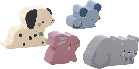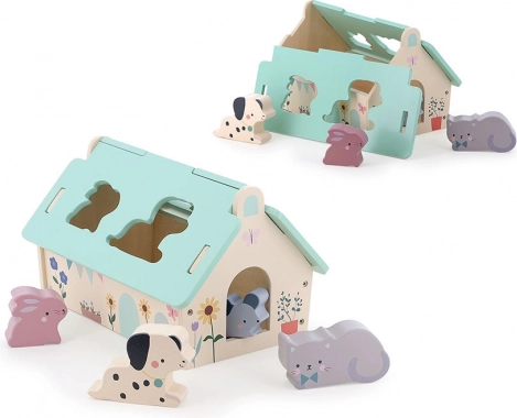 Odkryj malowniczy drewniany domek autorstwa Sarah Betz z wkładanymi zwierzątkami, takimi jak piesek, myszka, kotek i królik. Ta zabawka inspirowana metodą Montessori wspiera zwinność, koordynację i wyobraźnię dziecka.