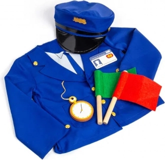 - Zawartość zestawu: niebieska marynarka z podszewką, czapka, zegarek kieszonkowy, identyfikator, 2 flagi sygnałowe (czerwona i zielona)