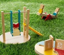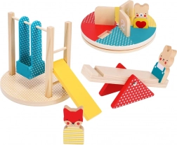 Przygotuj swoje dzieci na niezapomniane chwile na placu zabaw z tym drewnianym zestawem. Zawiera trzy figurki zwierząt, które ożywają na pełnym fantazji placu zabaw: