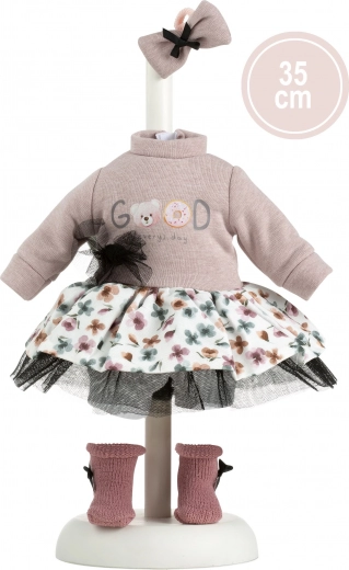 Zestaw obejmuje bluzkę z długim rękawem z kokardką i tiulowym akcentem, kwiecistą spódnicę z tiulową lamówką, miękkie skarpetki z kokardkami oraz ozdobną gumkę do włosów. Dzięki uniwersalnemu rozmiarowi łatwo ubiera się na lalki o wysokości 35 cm i wspiera kreatywną zabawę.
