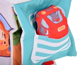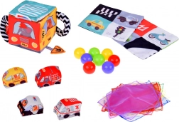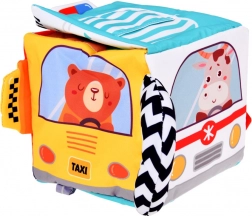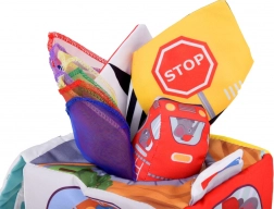 - Miękkie autka: Tekstylne samochodziki przedstawiające pojazdy jak Taxi, Straż pożarna, Policja, Karetka wydają delikatny dźwięk przy naciśnięciu, stymulując zmysł słuchu.