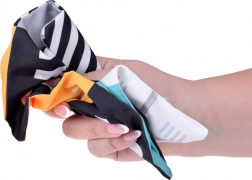 - Ukryte chusteczki: Wyciąganie i wkładanie kolorowych chusteczek to doskonałe ćwiczenie motoryki małej i koordynacji oko–ręka.