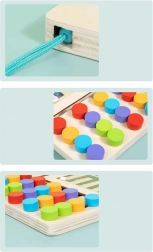 Drewniana gra planszowa ma różne wzory ułatwiające naukę kolorów i koordynacji. Wspiera kreatywność i koncentrację dzieci.