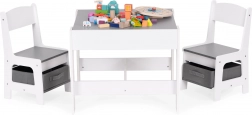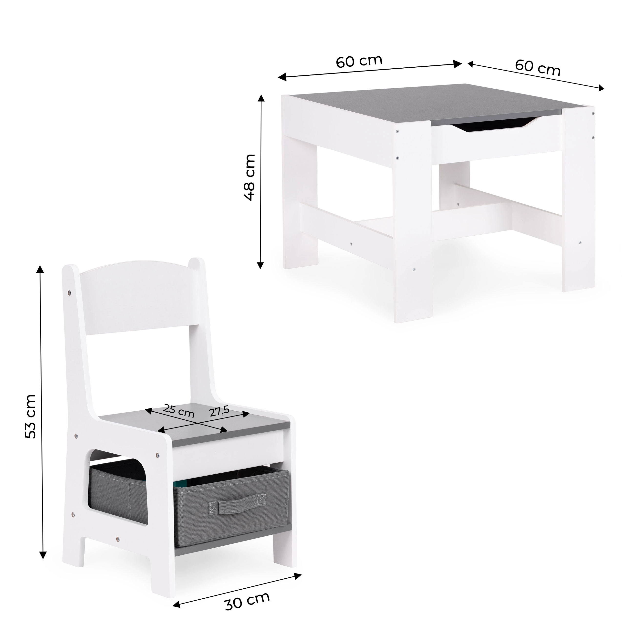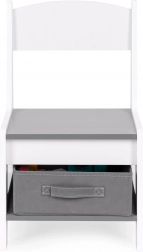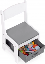 Schowek pod blatem stołu oferuje miejsce na zabawki i akcesoria. Krzesła wyposażone są w praktyczne materiałowe szuflady, które pozwalają trzymać wszystko, co ważne, zawsze pod ręką. Dzięki sprytnemu projektowi dzieci mogą łatwo zorganizować swoje otoczenie i uczyć się porządku.