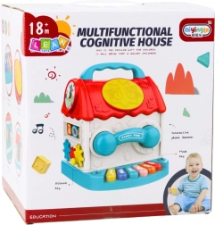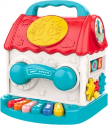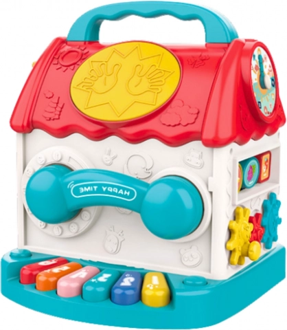 W zestawie znajduje się 8 kolorowych magnetycznych robaczków, które dziecko może wyciągać z otworów przy pomocy specjalnego magnetycznego dzięcioła. Ta czynność rozwija koordynację ręka–oko oraz precyzję ruchów. Telefon w formie grzechotki zachęca do zabawy dźwiękiem, natomiast sorter kształtów z 4 klockami uczy rozpoznawania figur geometrycznych. Każda ze ścianek domku ma inne funkcje, które zachęcają dziecko do odkrywania i interakcji.