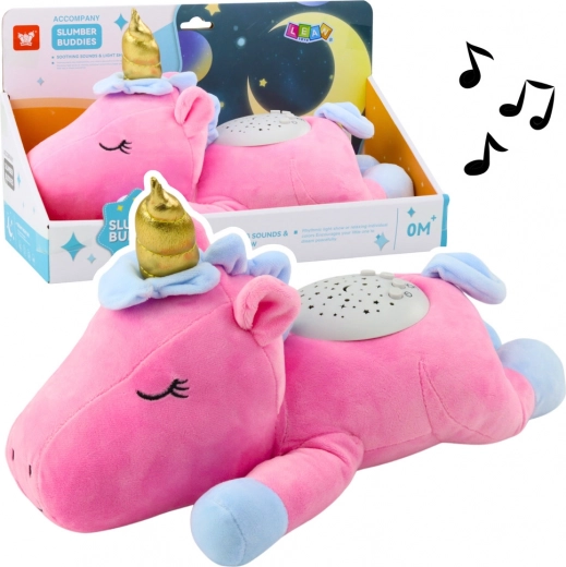 Ten pluszowy jednorożec został zaprojektowany, aby zapewnić dziecku kojące doświadczenie dzięki wbudowanemu projektorowi światła i dźwięku, który oferuje delikatne melodie oraz uspokajające światło. Idealna pomoc przy zasypianiu i poczuciu bezpieczeństwa.
