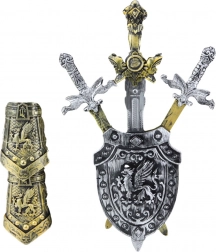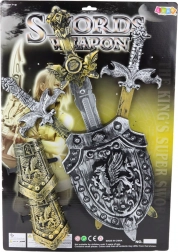 Zestaw obejmuje trzy różne miecze rycerskie, w tym jeden większy, główną broń wojownika, ozdobną tarczę z motywem heraldycznym oraz dwa ochraniacze na ręce imitujące elementy zbroi. Wszystkie części wykonano z lekkiego, a jednocześnie wytrzymałego plastiku, który jest bezpieczny i odporny na intensywną zabawę.