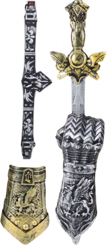Zestaw zawiera wszystkie najważniejsze elementy, które powinien mieć mały rycerz – miecz, pas oraz dwa dekoracyjne ochraniacze na ręce naśladujące zbroję. Wszystkie części są wykonane z wytrzymałego, a zarazem lekkiego i bezpiecznego materiału, idealnego do codziennej zabawy.