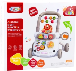 Chodzik ma kolorowy design z motywami zwierząt, takich jak lew i królik, które przyciągają uwagę dzieci i zachęcają je do aktywności. Solidna konstrukcja zapewnia bezpieczeństwo, a szeroka podstawa i cztery wytrzymałe koła zwiększają stabilność. Specjalna rączka pomaga, gdy dziecko uczy się chodzić. Wbudowane funkcje dźwiękowe i mechaniczne zabawki rozwijają koordynację oraz zmysły słuchu i dotyku.