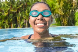 Wytrzymałe soczewki z poliwęglanu z filtrem UV chronią oczy przed szkodliwym promieniowaniem słonecznym przy odkrytych basenach i nad morzem.