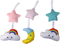 Zestaw zawiera trzy pluszowe zawieszki – księżyc, chmurkę i gwiazdę – zaprojektowane z myślą o bezpieczeństwie i stymulacji sensorycznej najmłodszych. Miękko dotykające figurki w pastelowych kolorach pomagają rozwijać wzrok, dotyk i koordynację ruchową dziecka. Karuzela pobudza ciekawość i zapewnia poczucie komfortu w każdej sytuacji.
