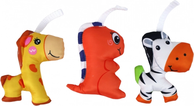 Centralnym elementem są trzy kolorowe pluszowe zabawki – zebra, żyrafa i czerwony dinozaur, które obracają się po uruchomieniu karuzeli. Ich ruch przyciąga uwagę dziecka i zachęca do śledzenia, co pozytywnie wpływa na rozwój koordynacji wzrokowo‑ruchowej. Intensywne barwy, przyjazne kształty i miękka tkanina wspierają wzrok, dotyk i wyobraźnię dziecka.