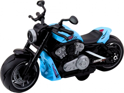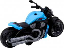 Motocykl dziecięcy zaprojektowano w wyrazistym niebieskim kolorze i wykonano z wysokiej jakości tworzywa sztucznego, odpornego na codzienne użytkowanie. Wyposażony jest w szerokie koła, masywną konstrukcję i ergonomiczne uchwyty, które zapewniają stabilność i wygodę podczas zabawy. Motorek imituje klasyczny jednoślad z realistycznymi detalami silnika i karoserii, co dodaje autentyczności.