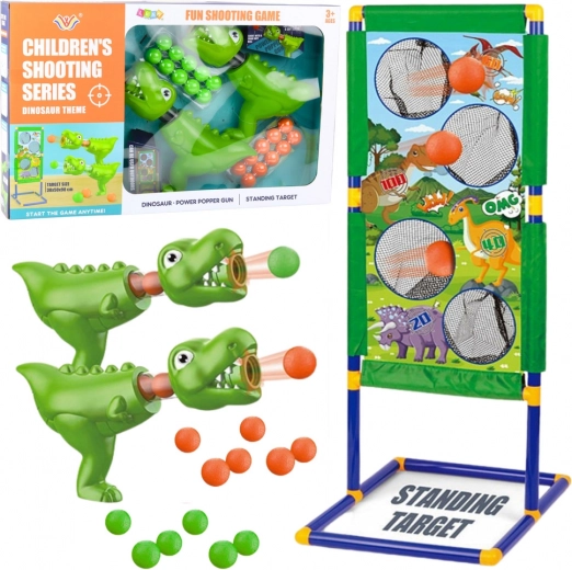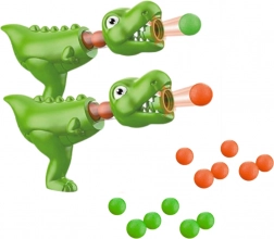 W zestawie znajdują się dwie wyrzutnie w kształcie zielonych dinozaurów, działające na zasadzie sprężonego powietrza – wystarczy nacisnąć, a piłeczka energicznie wylatuje w kierunku celu. Użytkowanie jest intuicyjne i bezpieczne, nie wymaga baterii ani ładowania. Wyrzutnie są lekkie, dopasowane do dziecięcych dłoni i pozwalają załadować aż 8 miękkich kuleczek jednocześnie, co płynnie zwiększa frajdę bez częstych przerw.