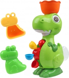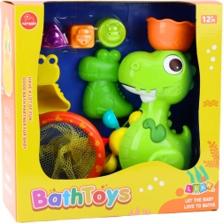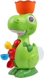 Poznacie zielonego dinozaura, który jest główną atrakcją tego zestawu. Towarzyszą mu różne kolorowe dodatki, takie jak siatka do chwytania oraz zestaw pływających zabawek o różnych kształtach i fakturach, które dzieci mogą chwytać i przelewać przez nie wodę.