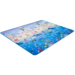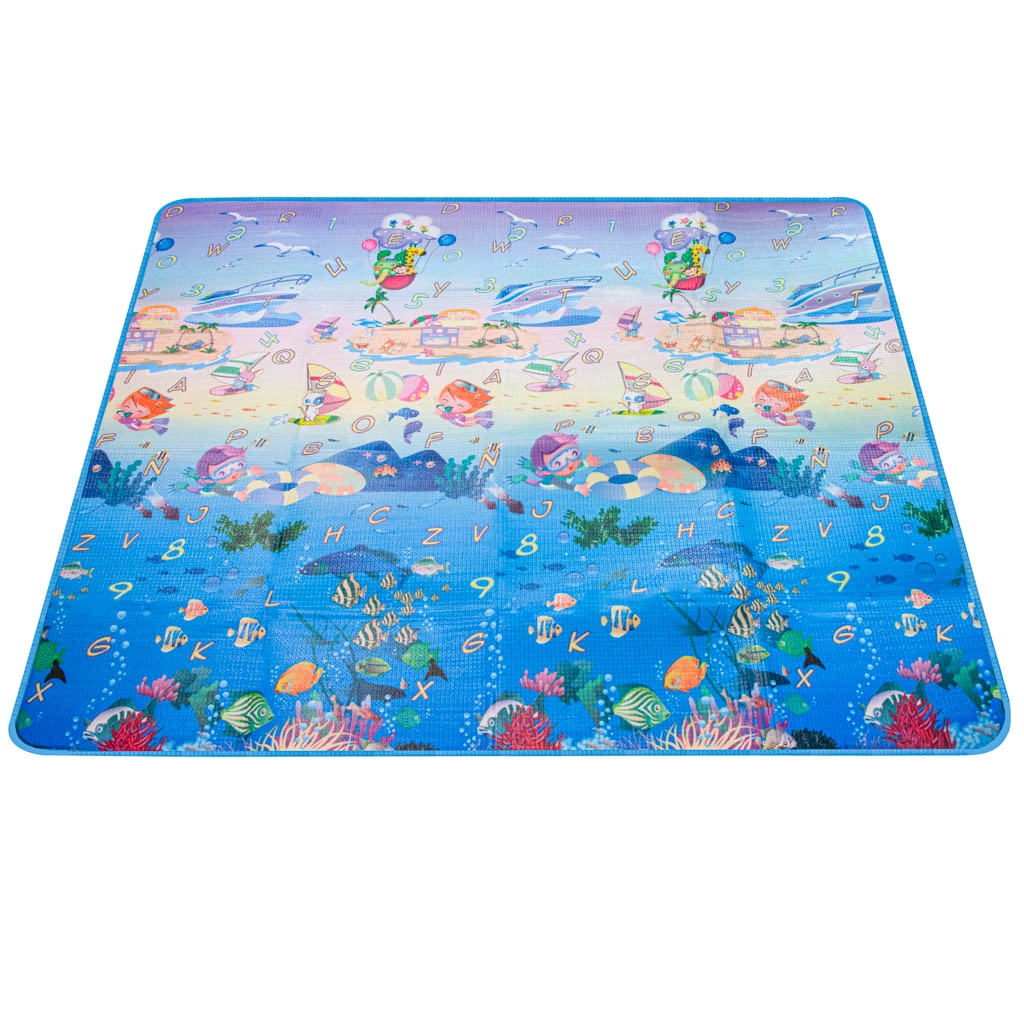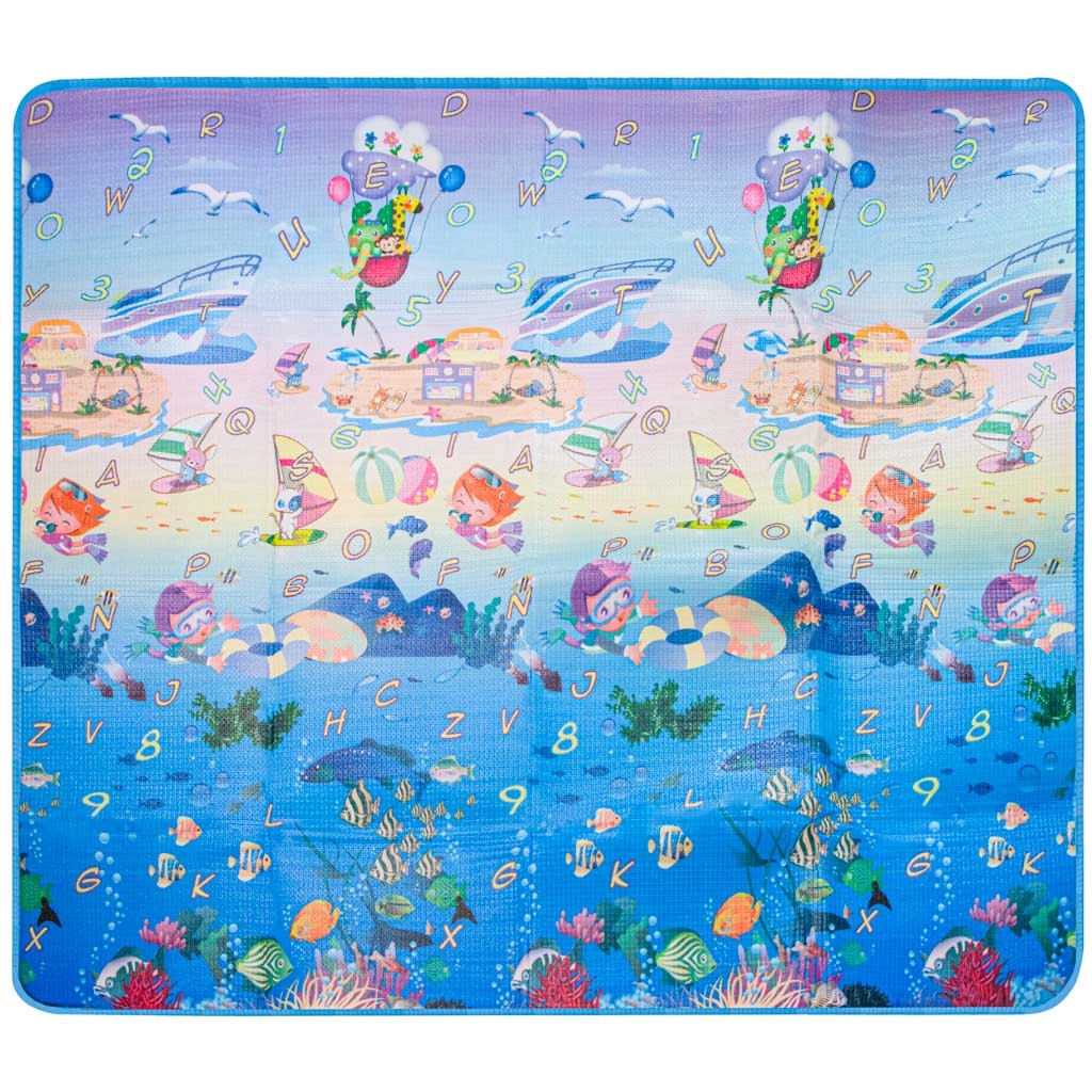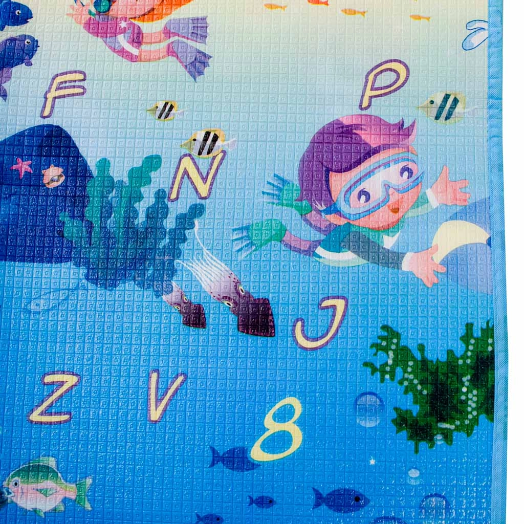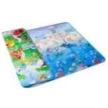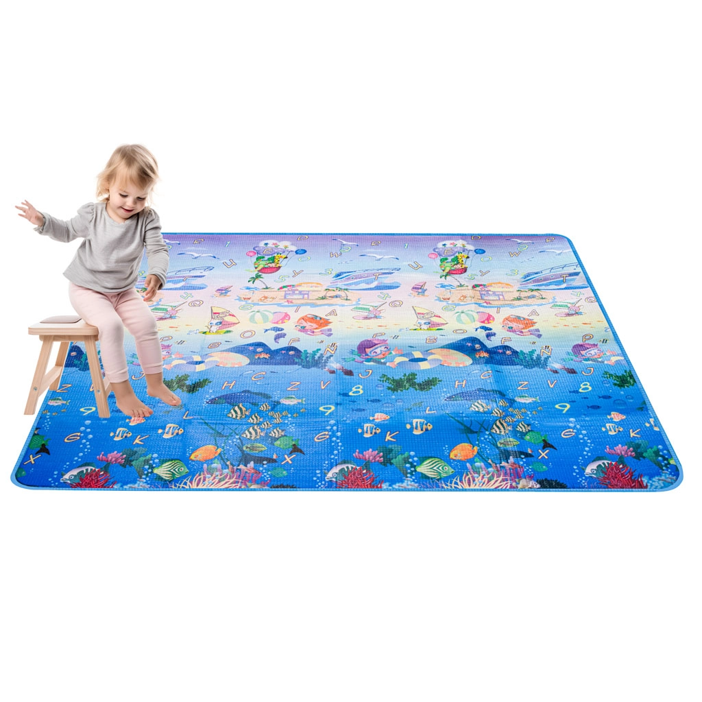 Dwustronna piankowa mata do zabawy dla dzieci zapewnia miękkie i bezpieczne miejsce do zabawy i nauki. Jedna strona przedstawia morski świat z literami i liczbami, druga wesołe zoo. Mata izoluje od chłodu, tłumi upadki i łatwo się czyści – wystarczy przetrzeć wilgotną ściereczką.