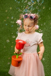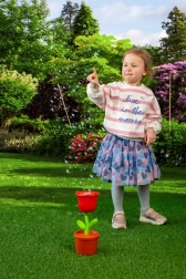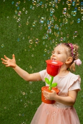 Kwiatowy design jest nie tylko uroczy, ale i praktyczny – stabilna „doniczka” dobrze leży w małych dziecięcych rączkach. Zestaw zawiera od razu 2×40 ml wysokiej jakości roztworu, więc można zaczynać zaraz po rozpakowaniu. Do działania potrzebne są 3× AA baterie (brak w zestawie).