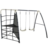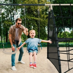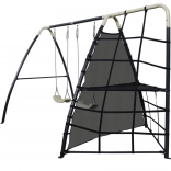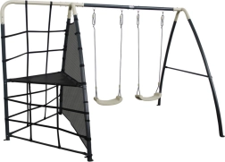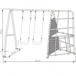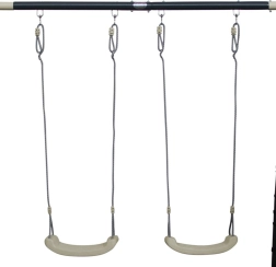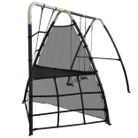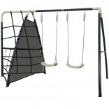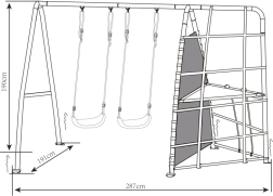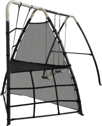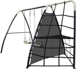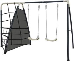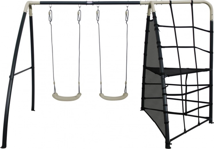 Poszczególne komponenty zaprojektowano z myślą o komforcie i bezpieczeństwie. Mocne kotwy gruntowe zapewniają stabilność nawet wtedy, gdy dzieci naprawdę się rozpędzą. Polipropylenowe siedziska są lekkie, trwałe i łatwe w czyszczeniu. Ergonomiczny kształt i odpowiednia głębokość sieci do wspinaczki zapewniają wygodę i dodatkową atrakcję podczas zabawy.
