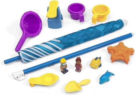 Ten stolik zawiera wiele akcesoriów do zabawy, w tym sitko, skocznię do wody, trzy kubeczki, cztery figurki oraz wodny spinner–rozgwiazdę. Górny zbiornik wodny ma pojemność 7,57 litra, a dolny 11,30 litra. Projekt produktu ułatwia prosty montaż i zapewnia stabilność.
