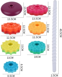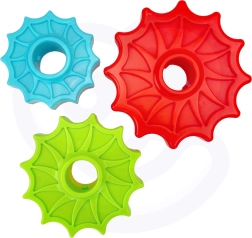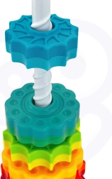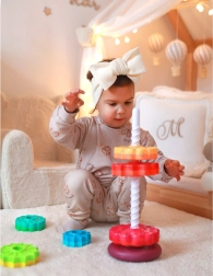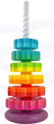 - Zestaw zawiera sześć dysków w kształcie gwiazdy, które można układać jeden na drugim, tworząc kolorową i wirującą piramidę