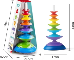 Wieża jest wykonana z wysokiej jakości plastiku bez BPA, a dzięki szerokiej podstawie pozostaje stabilna podczas zabawy. Wysokość całej wieży to około 34 cm, dzięki czemu jest dobrze dopasowana do małych rączek. Świetny wybór do codziennej zabawy w domu i jako oryginalny prezent.