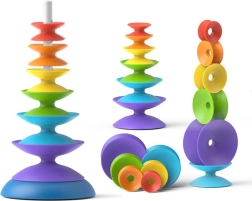 Ta edukacyjna zabawka sensoryczna łączy kreatywną zabawę z rozwojem umiejętności. Dziecko może układać 7 kolorowych krążków według wielkości lub barwy, pozwalać im zjeżdżać po spirali i wciąż testować nowe kombinacje. Wieża do układania wspiera małą motorykę, koordynację ręka–oko oraz percepcję kształtów i kolorów.