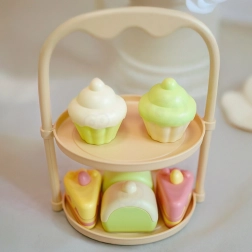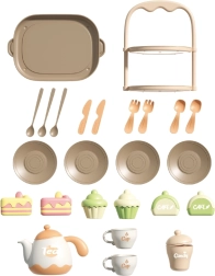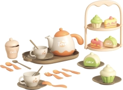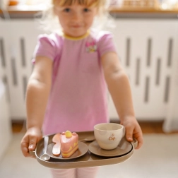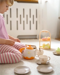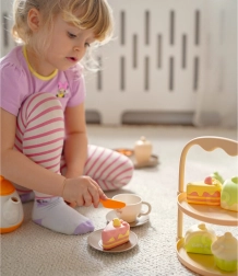 Czajniczek, filiżanki, spodeczki, tacka i stojak na desery – dzieci mogą nalewać herbatę i serwować smakołyki jak podczas prawdziwej uczty.