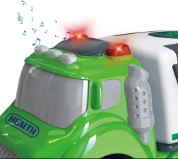 Śmieciarka City Truck to idealna zabawka dla każdego małego fana motoryzacji i miejskich pojazdów specjalnych. Śmieciarka jest wyposażona w realistyczne dźwiękowe i świetlne efekty, które aktywują się po naciśnięciu przycisku na dachu pojazdu.