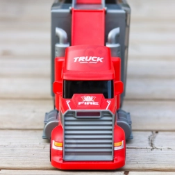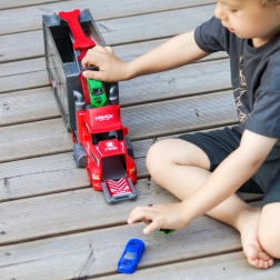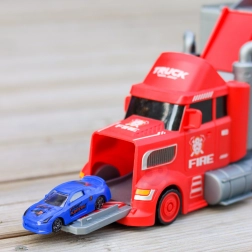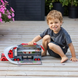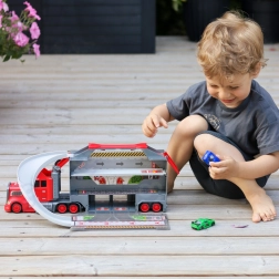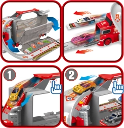 Ten wielofunkcyjny pojazd w atrakcyjnym strażackim designie służy jako ciągnik transportowy, a po rozłożeniu zamienia się w kompletny zestaw do zabawy z garażem, miejscami parkingowymi i dynamicznym torem. Dzięki wyrzutni aut dzieci rozpoczną wyścig w sekundę.