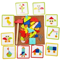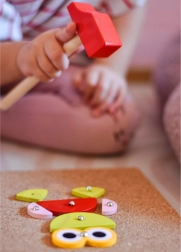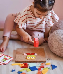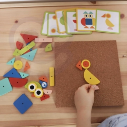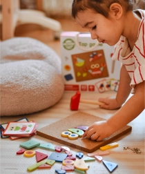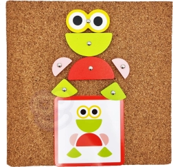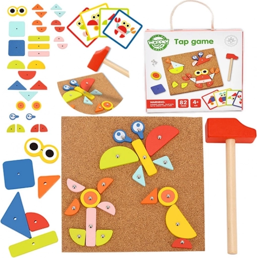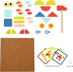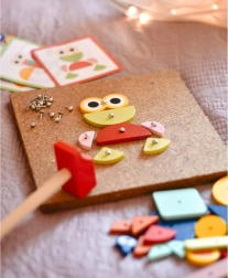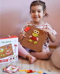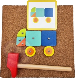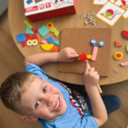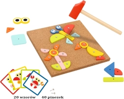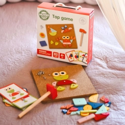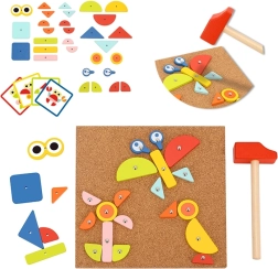 Woopie Green korkowa zabawka z młotkiem to świetny sposób na wspieranie kreatywności i logicznego myślenia dzieci. Zestaw składa się z 30 drewnianych klocków, 10 dwustronnych kart z 20 wzorami na trzech poziomach trudności, 40 pinezek, tablicy i młotka. Dzieci starają się dokładnie odwzorować wzór z karty za pomocą klocków o różnych kształtach i kolorach lub mogą tworzyć własne projekty wg własnej wyobraźni i kreatywności.