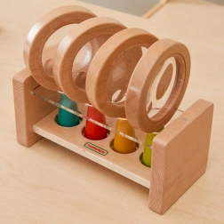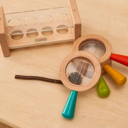 Przedstawiamy drewniany zestaw lup przeznaczony dla dzieci, aby mogły bezpiecznie i w sposób edukacyjny poznawać świat wokół siebie. Każda lupa ma ergonomiczny, drewniany uchwyt w żywych kolorach – czerwonym, zielonym, żółtym i niebieskim, dostosowany do małych dłoni.