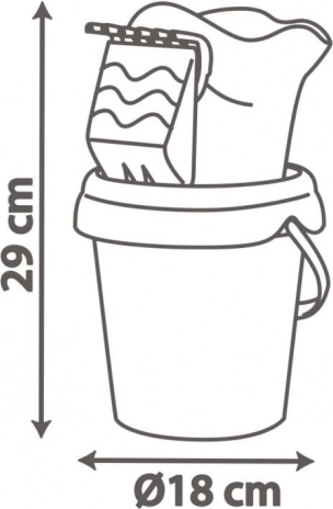 Zestaw zawiera wszystko, czego potrzeba do zabawy: wiaderko o średnicy 18 cm z sitkiem, grabkami, łopatką, foremką w kształcie serduszka lub kwiatka oraz konewkę na wodę. Kompaktowe wymiary i wysokość z akcesoriami 29 cm ułatwiają przenoszenie i przechowywanie.