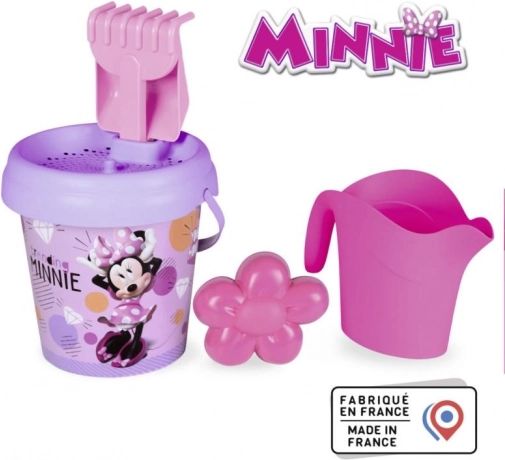 Wesoły zestaw do piasku z motywem MINNIE ucieszy każdego małego budowniczego. Zawiera wiaderko, sitko, grabki, łopatkę, foremkę i konewkę – wszystko do zabawy w piasku w domu i nad wodą. Średni rozmiar jest idealny do dziecięcych rąk i łatwy do przenoszenia.