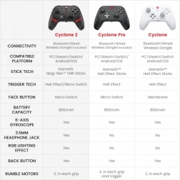 Bezprzewodowy kontroler GameSir Cyclone 2 oferuje połączenie zaawansowanej technologii i wygody dla graczy. Jest kompatybilny z platformami Switch, PC, Android, iOS oraz Steam i zapewnia trzy opcje łączenia – Bluetooth, przewodowo lub przez bezprzewodowy adapter.