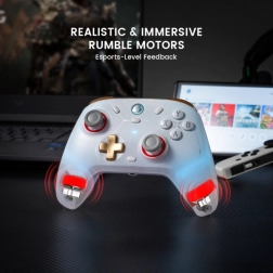 Kontroler GameSir Cyclone 2 jest wyposażony w drążki Mag-Res™ TMR dla precyzyjnego sterowania bez martwych stref oraz w spusty z efektem Halla, które gwarantują płynność i niezawodność. Zintegrowany żyroskop umożliwia dokładne śledzenie, a asymetryczne silniki wibracyjne w uchwytach zapewniają realistyczne wibracje. Mikrostyki pod przyciskami ABXY i dotykowy D-pad gwarantują szybką reakcję.