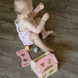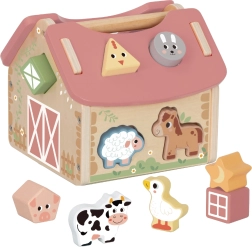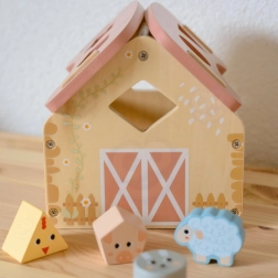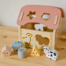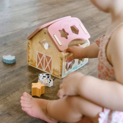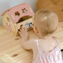 Urocza drewniana stodoła z wycięciami na zwierzątka i kształty motywuje dzieci do aktywnej zabawy i naturalnej nauki. Wkładanie odpowiednich elementów ćwiczy cierpliwość, koncentrację oraz rozumienie przyczyny i skutku. Pastelowy, naturalny design świetnie wpasuje się do dziecięcego pokoju.