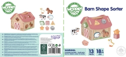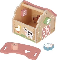 Dach łatwo się otwiera, co ułatwia wyjmowanie elementów i ich przechowywanie. Starannie wykończone, drewniane elementy z zaokrąglonymi krawędziami zapewniają bezpieczną zabawę. W zestawie znajdują się zwierzątka (krówka, owieczka, konik, gęś) oraz kształty z nadrukiem, które wspierają rozwój słownictwa i wyobraźni.