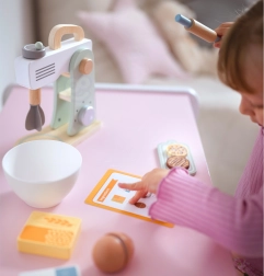 Odkryj magię pieczenia z drewnianym mikserem w delikatnych pastelowych barwach, który pozwoli dzieciom naśladować świat dorosłych. Od kręcenia pokrętłem po mieszanie w misce – realistyczne detale i bezpieczne, zaokrąglone elementy z wysokiej jakości drewna czynią z niego idealny dodatek do każdej dziecięcej kuchni.