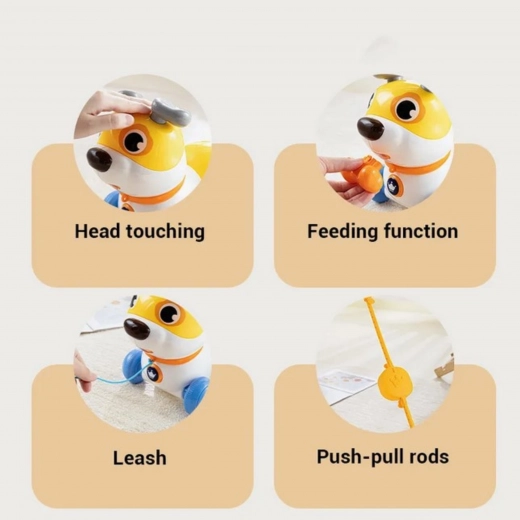 Piesek szczeka i wydaje realistyczne dźwięki, reaguje na dotyk, a po „nakarmieniu” dołączoną kostką okazuje radość. Obracające się uszka i ogonek 360° zwiększają stymulację sensoryczną, a elastyczny uchwyt umożliwia płynne przesuwanie po podłodze bez zacinania – w domu i na dywanie.