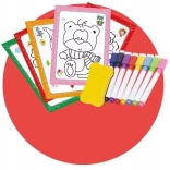 W komplecie jest wszystko, czego potrzeba do natychmiastowej zabawy: 8 markerów suchościeralnych, gąbka do ścierania, zestaw kolorowych klocków oraz 18 dwustronnych kart do wielokrotnego ćwiczenia. Analogowy zegar z ruchomymi wskazówkami pomaga w nauce czasu. Stabilne nóżki i poręczny uchwyt ułatwiają przenoszenie i bezpieczne użytkowanie.