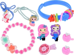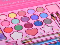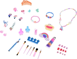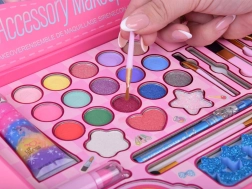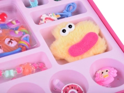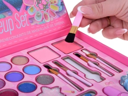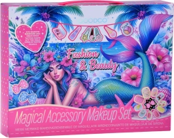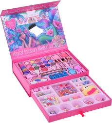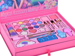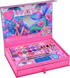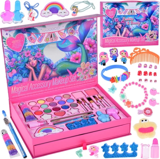 Po otwarciu dzieje się cud! Ale bez stresu – w tym pozytywnym sensie! :) W środku znajdziesz spełnienie marzeń każdej miłośniczki makijażu! Dodatkowo kuferek zawiera szufladkę pełną akcesoriów do włosów i biżuterii. Prawie każdy element ma motyw syrenki lub detal związany ze słodkim, dziewczęcym światem.