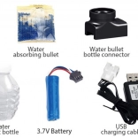 W opakowaniu znajdziesz blaster, podajnik, okulary ochronne, akumulator do ładowania i kabel USB. Wystarczy nawodnić kulki i można grać.