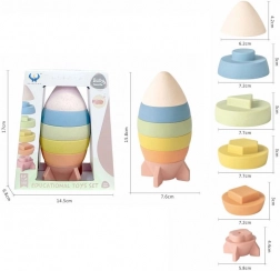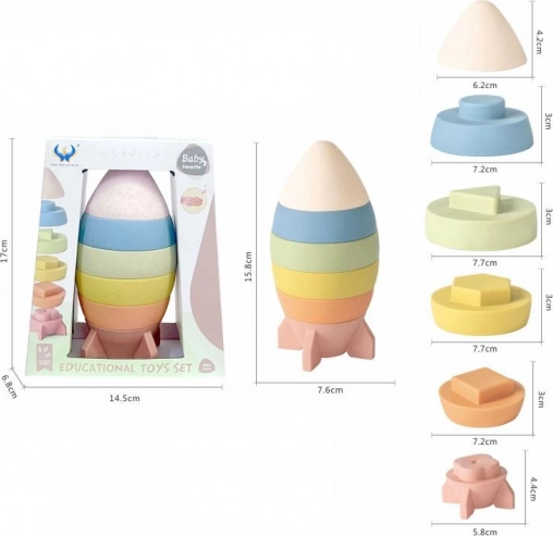 Zabawna zabawka do układania w kształcie rakiety, która w naturalny sposób uczy dzieci rozpoznawania kolorów i kształtów, trenuje motorykę małą i wspiera koordynację oko–ręka. Idealna do pierwszych odkryć i układania.