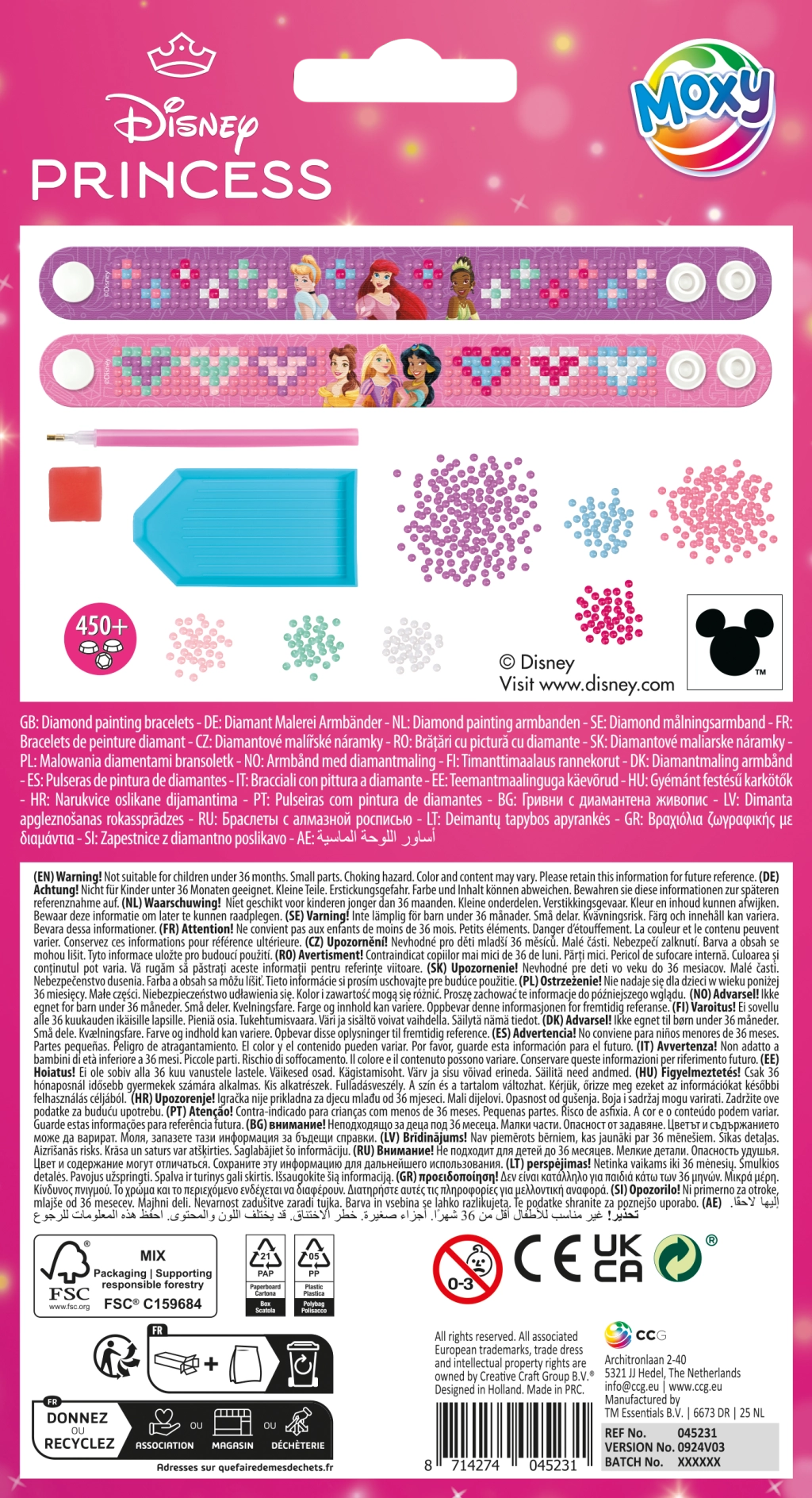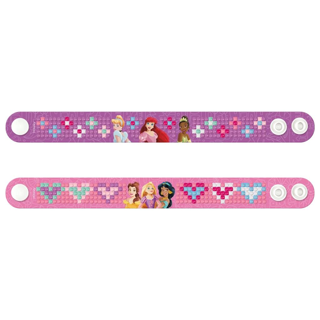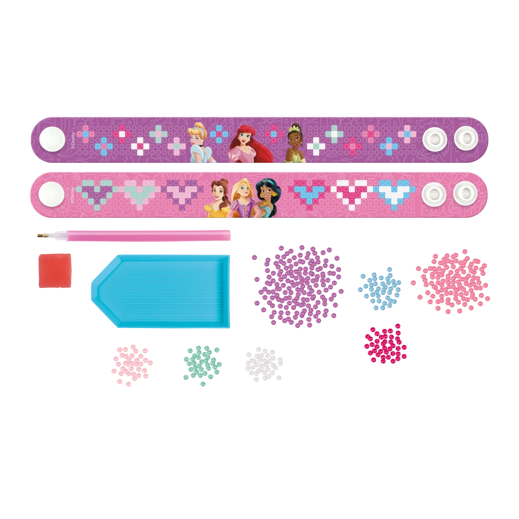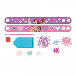 Stwórz własne lśniące bransoletki z motywem Księżniczek Disneya dzięki malowaniu diamentowemu! Ten kreatywny zestaw zawiera wszystko, czego potrzebujesz do ozdobienia dwóch oryginalnych bransoletek błyszczącymi kryształkami.