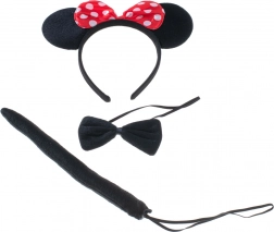 Uroczy zestaw do przebierania w mgnieniu oka zamieni każde dziecko w sympatyczną myszkę. Zawiera opaskę z uszkami i czerwoną kokardą w grochy, czarną muszkę i miękki ogonek. Świetny wybór na karnawał, Halloween i imprezy tematyczne – uniwersalny rozmiar, wygodne noszenie i trwałe, tekstylne wykonanie.