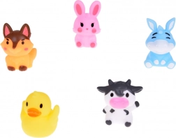 Zestaw zawiera: 5 gumowych figurek zwierząt z farmy, każda w innym kolorze (królik, krowa, pies, kaczka, osioł) o wymiarach około 5 cm x 4 cm x 4 cm. Zabawka wykonana jest z bezpiecznych, gumowych materiałów przyjaznych dla wrażliwej skóry dzieci. Łatwa w utrzymaniu i bardzo wytrzymała, dzięki czemu posłuży długi czas.